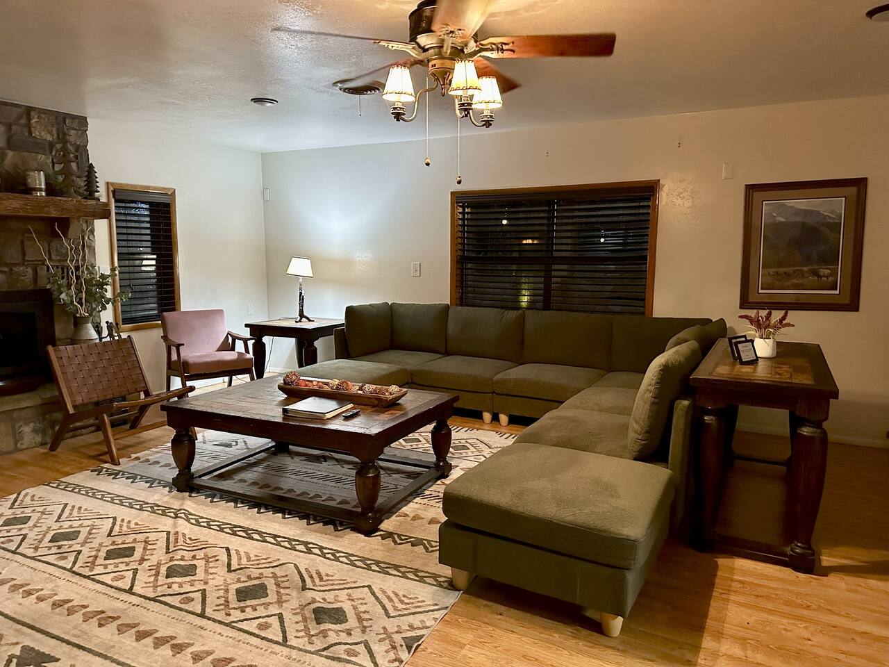 Relax on swings and a hammock around the firepit, play outdoor games under the string lights, or soak in the spacious hot tub. Step inside and be greeted by warm wood interiors, cozy furnishings, and an inviting real wood-burning fireplace—perfect for chilly evenings.
