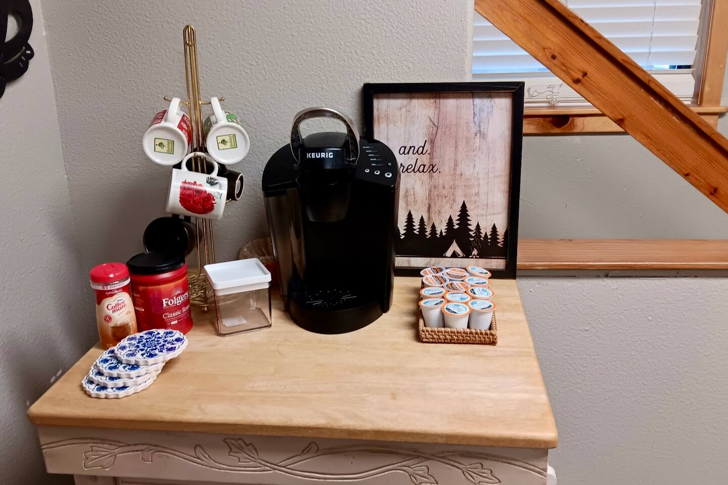 ✓ Coffee maker (Keurig and drip) with starter K-cups and ground coffee